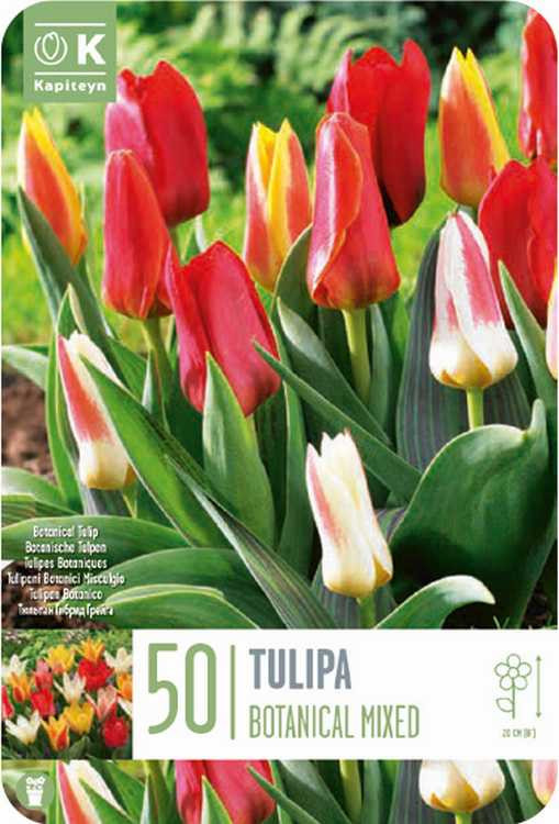 A botanikai tulipánok alacsony növésűek (15–25 cm), egyszerű, elegáns virágokat hoznak február végétől március végéig. Különböző színű, vadon élő fajok és korai hibridek keveréke, amelyek gyepbe, sziklakertbe vagy természetes hatású rézsűbe ideálisak. A nagy kiszerelés lehetőséget ad sűrű, természetes hatású beültetésre.Ültetési és gondozási útmutató:– Ültetési idő: szeptember–november– Ültetési mélység: 8–10 cm– Fényigény: napos hely– Virágzási idő: február vége–március vége– Talaj: jó vízáteresztésű, laza, kavicsos talaj is megfelelő– Gondozás: Teljesen télálló, évről évre elszaporodik. Nem igényel bolygatást, hagyjuk természetesen elterjedni.Ajánlott társítás:Krókusz, szibériai csillagvirág, hóvirág, tavaszi kankalin.