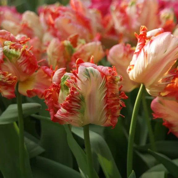 A csoportba jellegzetes virágformájuk alapján kerültek a fajták, amelyek többségében a Triumph csoportba tartozó vagy az Egyszerű késői virágzású tulipánok mutációi. Igen nagy, akár 20 cm-t is elérő virágjuk bimbóban sokáig zöld színű, a zöld szín sokszor a kinyílt, általában többszínű virágon is megtalálható. Lepelleveleik mélyen rojtosak, hullámosak, csavarodottak, esetenként egészen bizarr megjelenésűek. A legtöbb fajta virágja erősen szétnyílik, kiterül, közepe fekete. Virágágyba, szegélyekbe vagy vágott virágnak ültessük, Nagy, nehéz virágjuk szeles helyen támasztékot igényel. A növény áttelelő része télen a szabadban, helyén hagyható, a hagymát, gumót stb. nem szükséges ősszel felszedni. Amennyiben az áttelelt növényállomány túlságosan elsűrűsödött, szétosztásuk, felújításuk, átültetésük a nyári hónapokban végezhető. Ássuk ki a növényeket lombjuk leszáradásakor vagy közvetlenül utána. A szétválasztás, osztályozás után a visszaültetése szánt hagymák, gumók esetleges sebeit hagyjuk szellős, hűvös helyen beszáradni. Ezután, még a nyár végén vagy kora ősszel, ültessük el őket, hogy a telet már jól begyökeresedve várhassák. Télálló. Méret: 50 cm Virágzás: április-május Ültetés: augusztus/október Fényigény: nap, félárnyék Télállóság: igen Felhasználás: évelőágy, virágszegély, vágott-virág Kiszerelés: 8 db/csomag