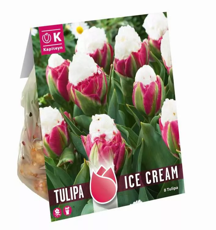 A Tulipa Double ‘Ice Cream – Corn of Flavour’ egy világhírű, feltűnően különleges megjelenésű tulipánfajta, amely a fagylaltos csészére emlékeztető virágzatáról kapta nevét. A 8 hagymát tartalmazó csomag telt virágú, kompakt, kb. 35–40 cm magas növényeket nevel. A virág április végén–május elején bontja krémfehér belső szirmait, amelyeket mély rózsaszín vagy mályva külső szirmok ölelnek körbe – így válik a kert egyik legfeltűnőbb ékkövévé. Napfénykedvelő növény, humuszos, laza szerkezetű talajt igényel, 12–15 cm mély ültetéssel. Legszebben szoliterként vagy más pasztell, telt virágú tulipánokkal társítva mutat, mint például a ‘Wedding Bouquet’ vagy a ‘Crispa Mix’. Balkonládában és előkertben is megállja a helyét. Különlegességek kedvelőinek ajánljuk.