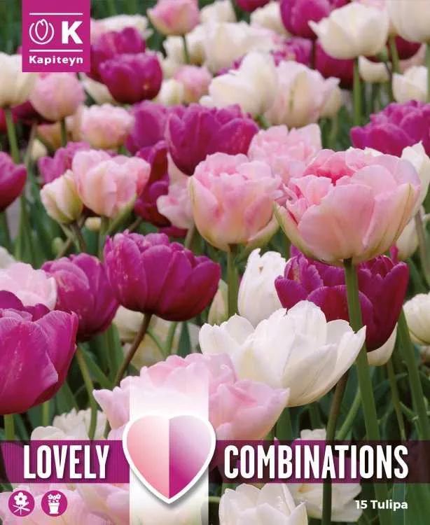 Ez a 15 hagymás válogatás rózsaszín, lila és fehér teltvirágú tulipánokat tartalmaz, romantikus és elegáns hangulatot teremtve. Közepesen magas, április végén–májusban virágzó fajtákból áll. Tökéletes csokorhoz és virágágyásba is. Társítható pasztell árnyalatú jácintokkal és boglárkával. Letisztult és dekoratív választás.