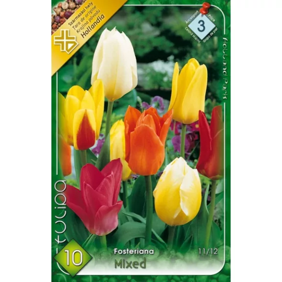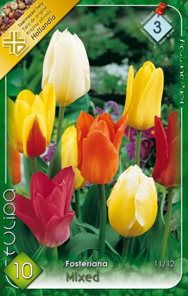 A közép-ázsiai Tulipa fosteriana változatai és hibridjei. Nagy, széles leveleik esetenként barna csíkosak. Virágjuk hosszú kúp alakú vagy tojásdad, napsütésben szélesre nyílik. A színválaszték szűk, a piros, fehér, sárga és narancs árnyalatai és kombinációi találhatók meg. Évelőágyba, szegélybe, virágágyba, növénytartóba ültethetők. Egyes fajták vágott virágnak, mások cserepes hajtatásra is kiválóak. A növény áttelelő része télen a szabadban, helyén hagyható, a hagymát, gumót stb. nem szükséges ősszel felszedni. Amennyiben az áttelelt növényállomány túlságosan elsűrűsödött, szétosztásuk, felújításuk, átültetésük a nyári hónapokban végezhető. Ássuk ki a növényeket lombjuk leszáradásakor vagy közvetlenül utána. A szétválasztás, osztályozás után a visszaültetése szánt hagymák, gumók esetleges sebeit hagyjuk szellős, hűvös helyen beszáradni. Ezután, még a nyár végén vagy kora ősszel, ültessük el őket, hogy a telet már a jól begyökeresedve várhassák. Télálló. Méret: 25-40 cm Virágzás: április Ültetés: augusztus/október Fényigény: nap, félárnyék Télállóság: igen Felhasználás: évelőágy, virágszegély, vágott-virág Kiszerelés: 10 db/csomag