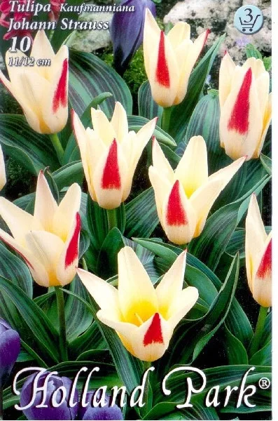 A turkesztáni eredetű Tulipa kaufmanniana fajnak az 1900-as évektől létrehozott változatai és hibridjei. Széles, enyhén hullámos szélű, szürkészöld levelein sokszor barna, márványos rajzolat, csíkozás látható. A hosszúkás alakú virágain napos időben csillag alakúra szétnyílik, este becsukódik. Legtöbbször kétszínű, a belső oldal világosabb, közepe sárga vagy fekete. Korai virágzású, sziklakertbe, virágszegélybe, évelőágy előterébe, virágládába ültethető fajták. Háborítatlanul hagyva jól szaporodnak, sűrűsödnek, a kisebb sarjhagymákról is egyre több virágot nevelnek. Cserepes hajtatásra kiválóak. A növény áttelelő része télen a szabadban, helyén hagyható, a hagymát, gumót stb. nem szükséges ősszel felszedni. Amennyiben az áttelelt növényállomány túlságosan elsűrűsödött, szétosztásuk, felújításuk, átültetésük a nyári hónapokban végezhető. Ássuk ki a növényeket lombjuk leszáradásakor vagy közvetlenül utána. A szétválasztás, osztályozás után a visszaültetése szánt hagymák, gumók esetleges sebeit hagyjuk szellős, hűvös helyen beszáradni. Ezután, még a nyár végén vagy kora ősszel, ültessük el őket, hogy a telet már a jól begyökeresedve várhassák. Méret: 20 cm Virágzás: március-április Ültetés: augusztus/október Fényigény: nap Télállóság: igen Felhasználás: sziklakert, évelőágy, virágszegély, balkonláda, cserepes, hajtatás Kiszerelés: 10 db/csomag